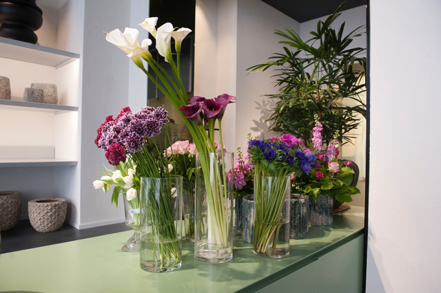 E’ qui che su dei grandi banchi verdi sono esposte le creazioni e le scenografie floreali, vasi e diversi